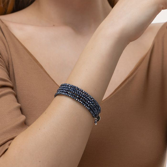 Look brillante in poche mosse: questo bracciale a molla unisce stile e praticità con un twist moderno. Realizzato con cristalli in vetro sfaccettato color blu notte, cattura la luce con riflessi metallici intensi e un finish super luminoso. Il design avvolgente si adatta perfettamente al polso senza bisogno di chiusure, ideale da indossare ogni giorno, da solo o insieme ad altri bracciali per uno stack scintillante. Materiale: vetro e placcatura argento. Nickel tested. Gioielli fatti a mano, unici e artigianali, perfetti per tutti i tuoi look o come idea regalo.