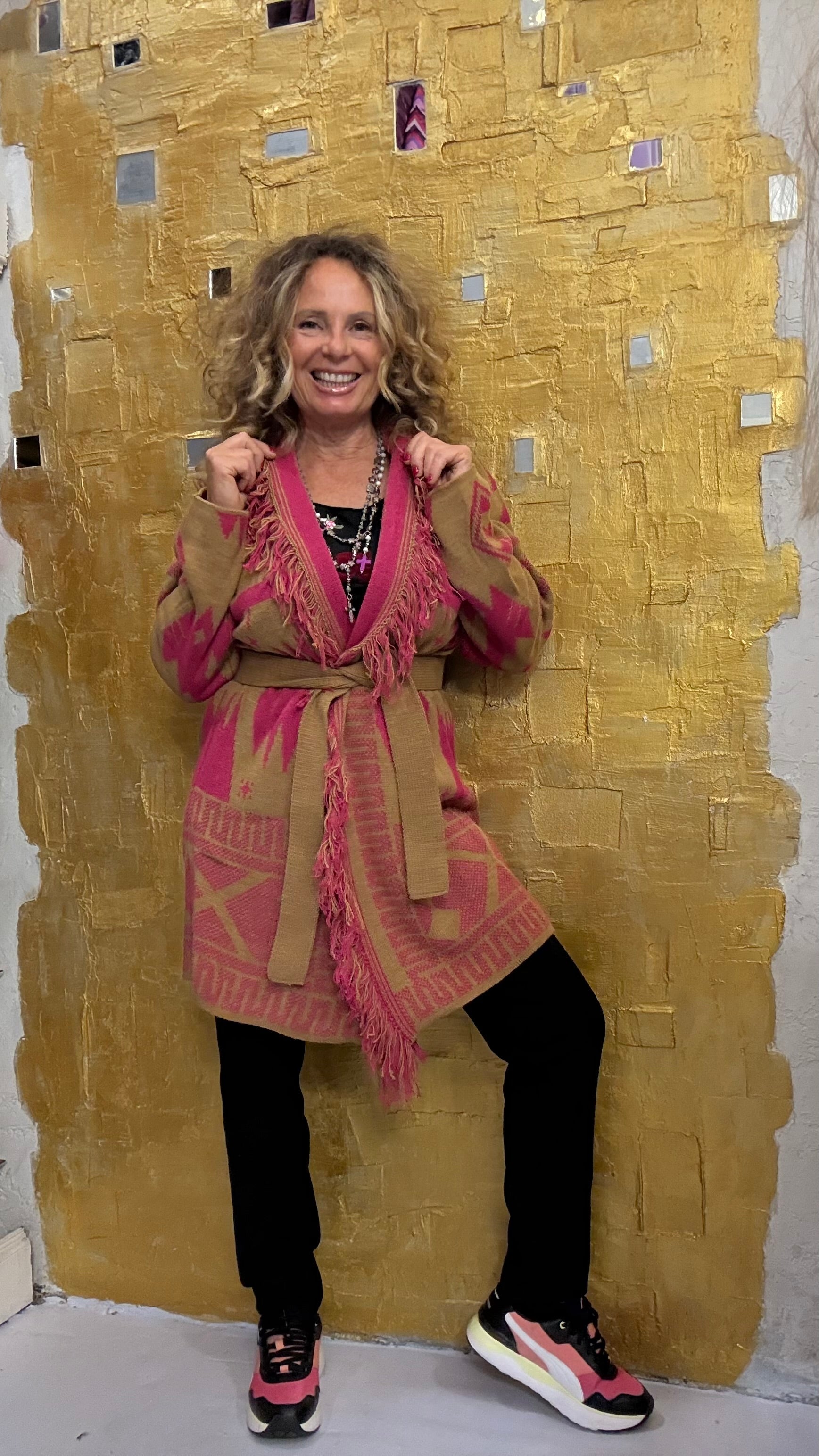 Cardigan lunghezza media con frange stile incas by Ayfee. Jacquard con cintura. Disponibile in bianco/nero e beige/fucsia brillante. 60% acrilico, 20% viscosa, 20% lana.