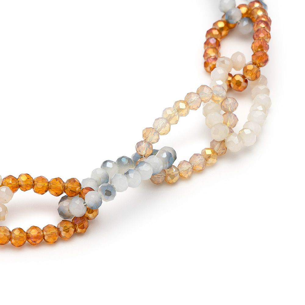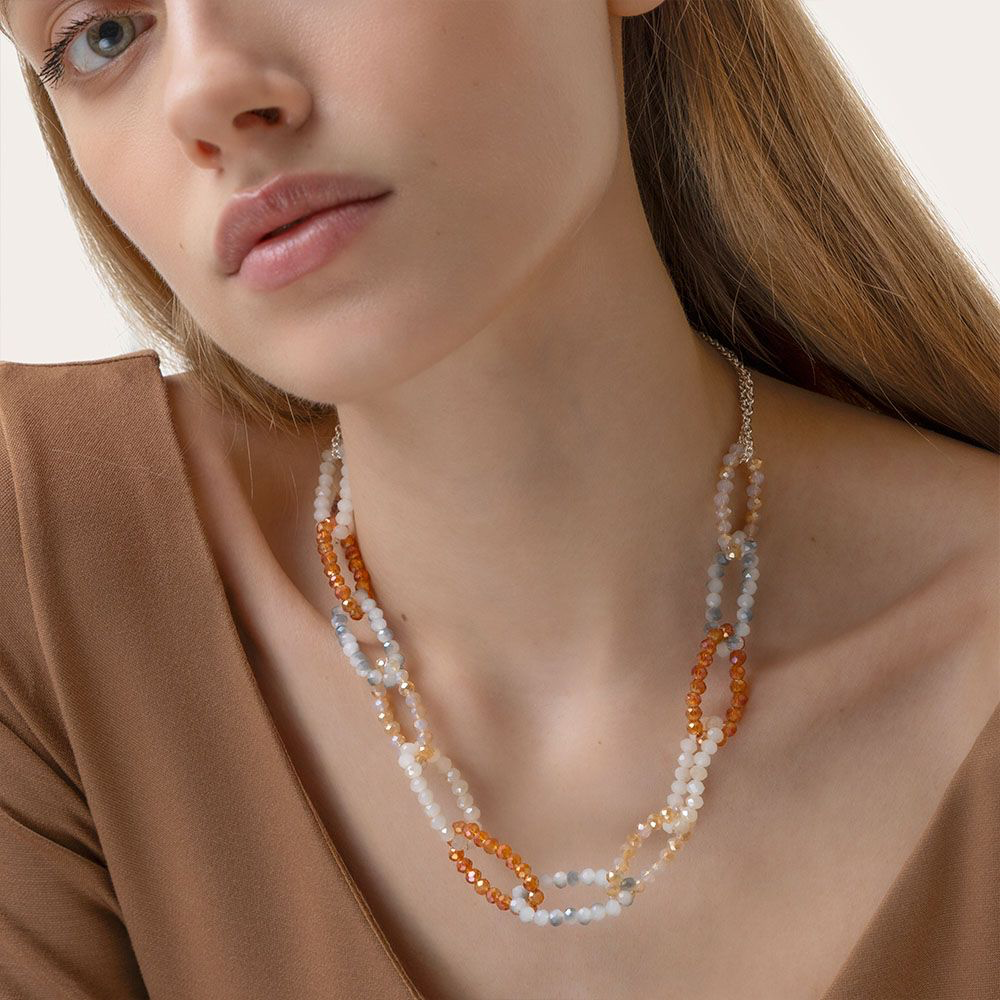 Iconica e oversize, per chi ama distinguersi. Questa collana dal design contemporaneo è interamente realizzata a mano intrecciando cristalli colorati in una sequenza fluida e luminosa. Le sfumature delicate del bianco latte e dell’azzurro polvere si mescolano armoniosamente ai toni caldi dell’ambra e del miele, creando un equilibrio cromatico raffinato e originale. La lavorazione a catena dona movimento e leggerezza al gioiello, perfetto per trasformare un semplice look in un outfit da passerella. Materiale: vetro e placcatura argento. Lunghezza collana: 40 cm. Lunghezza extra chain: 6,5 cm. Nickel tested. Gioielli fatti a mano, unici e artigianali, perfetti per tutti i tuoi look o come idea regalo.