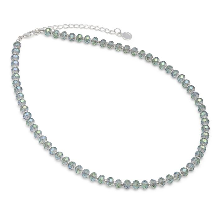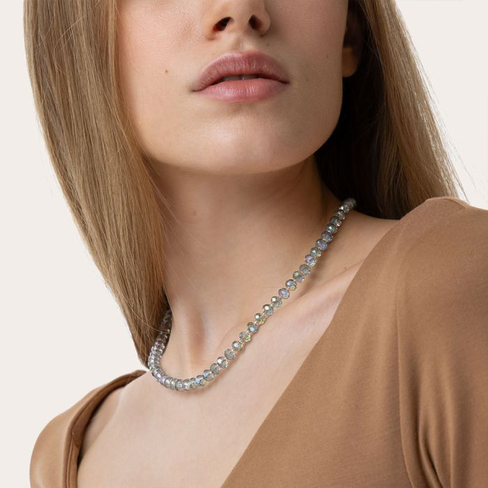 Stile classico, design unico. Questa collana girocollo è caratterizzata da sfere rotonde e sfaccettate, ricche di riflessi e personalità. Il modello grigio perla conserva sfumature verdi e azzurre per un effetto elegante e caleidoscopico. La variante blu notte è un evergreen da indossare su tutto, mentre il modello ambra aggiunge una nota raffinata e femminile su colori pastello o denim looks. Materiale: vetro e placcatura argento. Lunghezza collana: 42 cm. Lunghezza extra chain: 6,5 cm. Nickel tested. Gioielli fatti a mano, unici e artigianali, perfetti per tutti i tuoi look o come idea regalo.