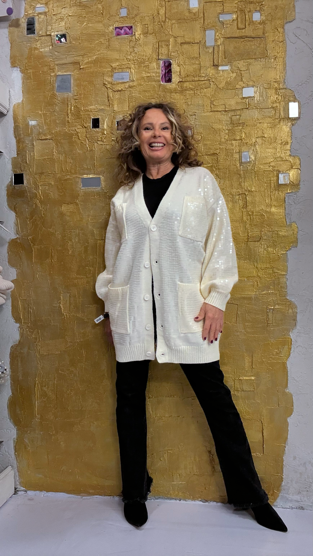 Cardigan soffice e caldo con paillettes luminose sul davanti. Maniche e retro senza paillettes. Versatile per tutti i giorni o look sofisticati.