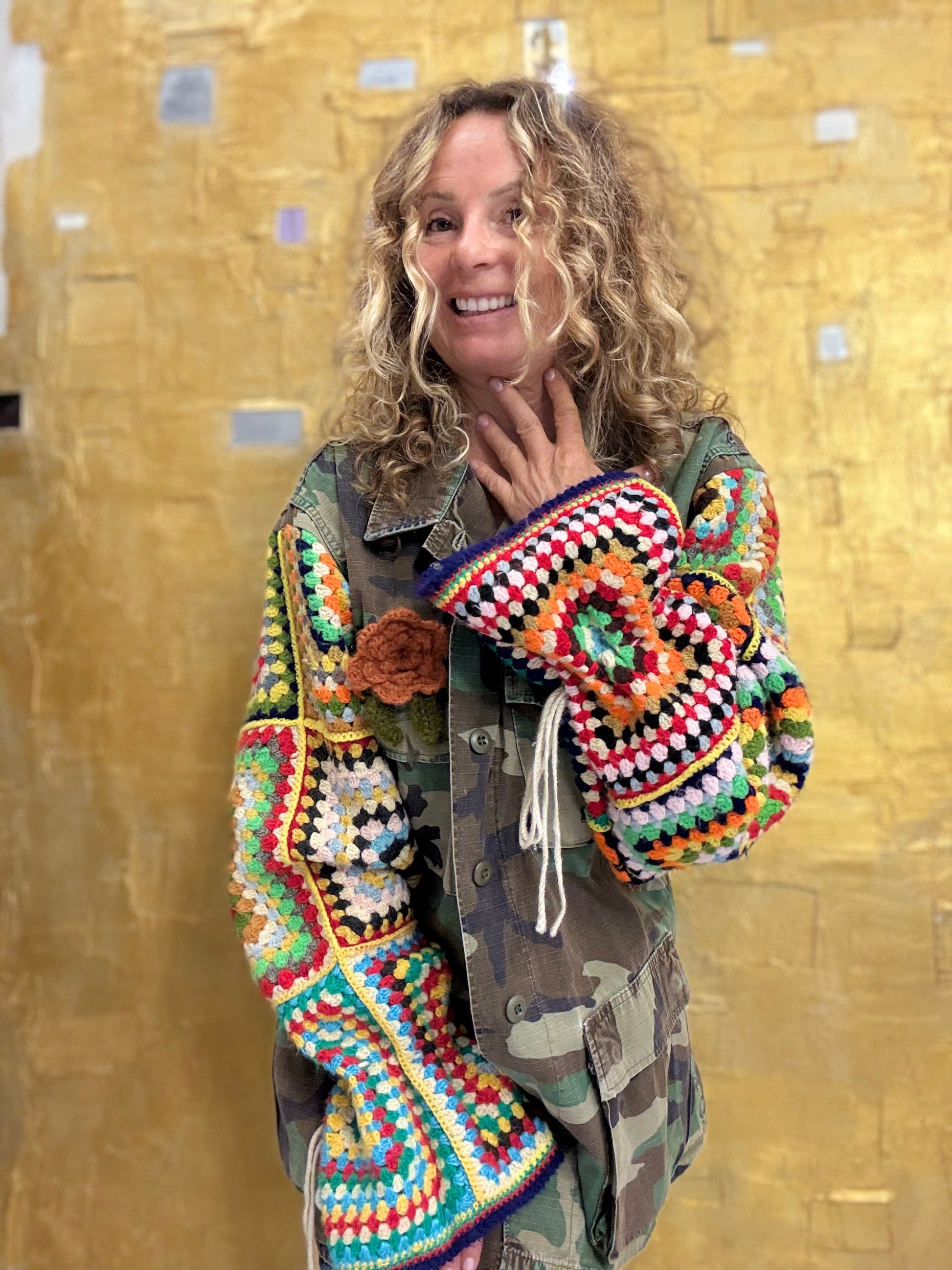 Una giacca unica che unisce lo stile militare del camouflage con la creatività delle maniche tricot multicolore. Perfetta per chi ama distinguersi con un look originale e audace.