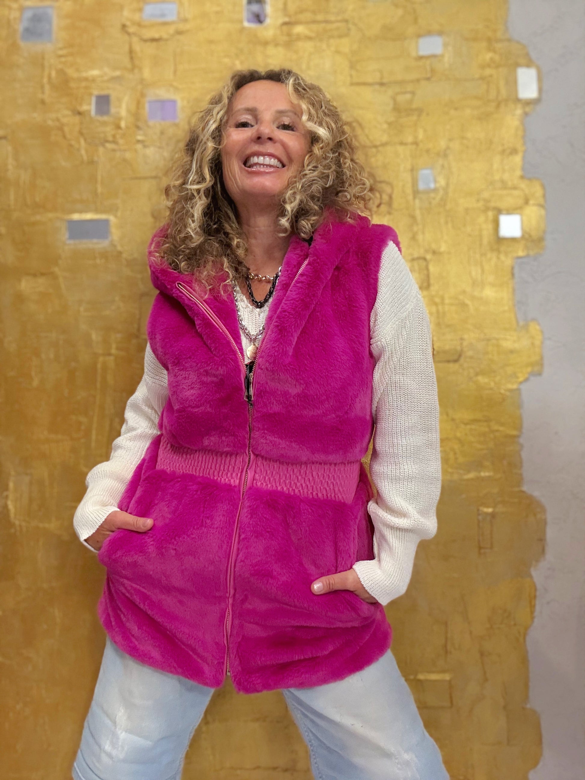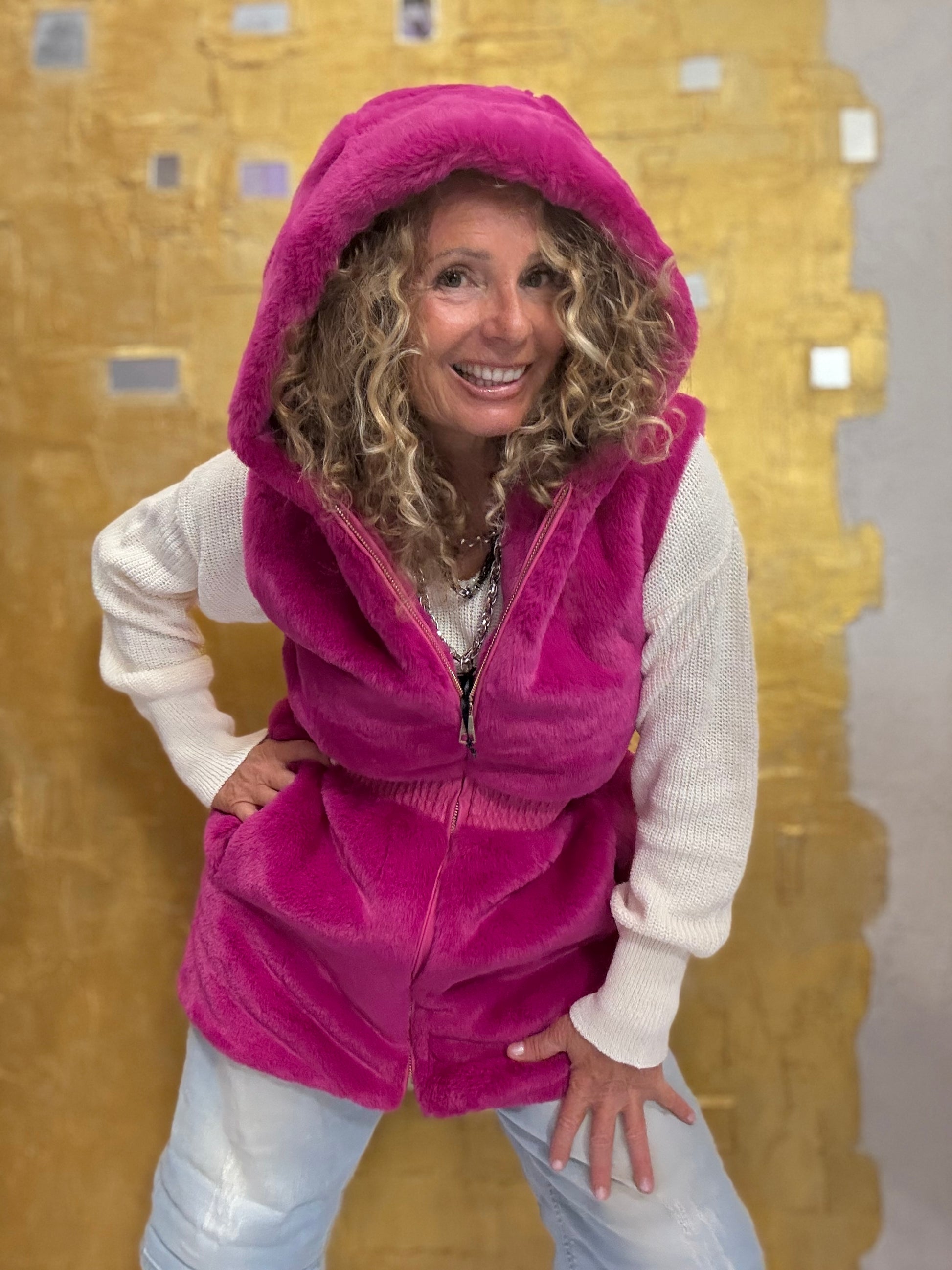 GILET AVVITATO CAPPUCCIO PELLICCIA TINTA UNITA, 3TG. 100% POLI