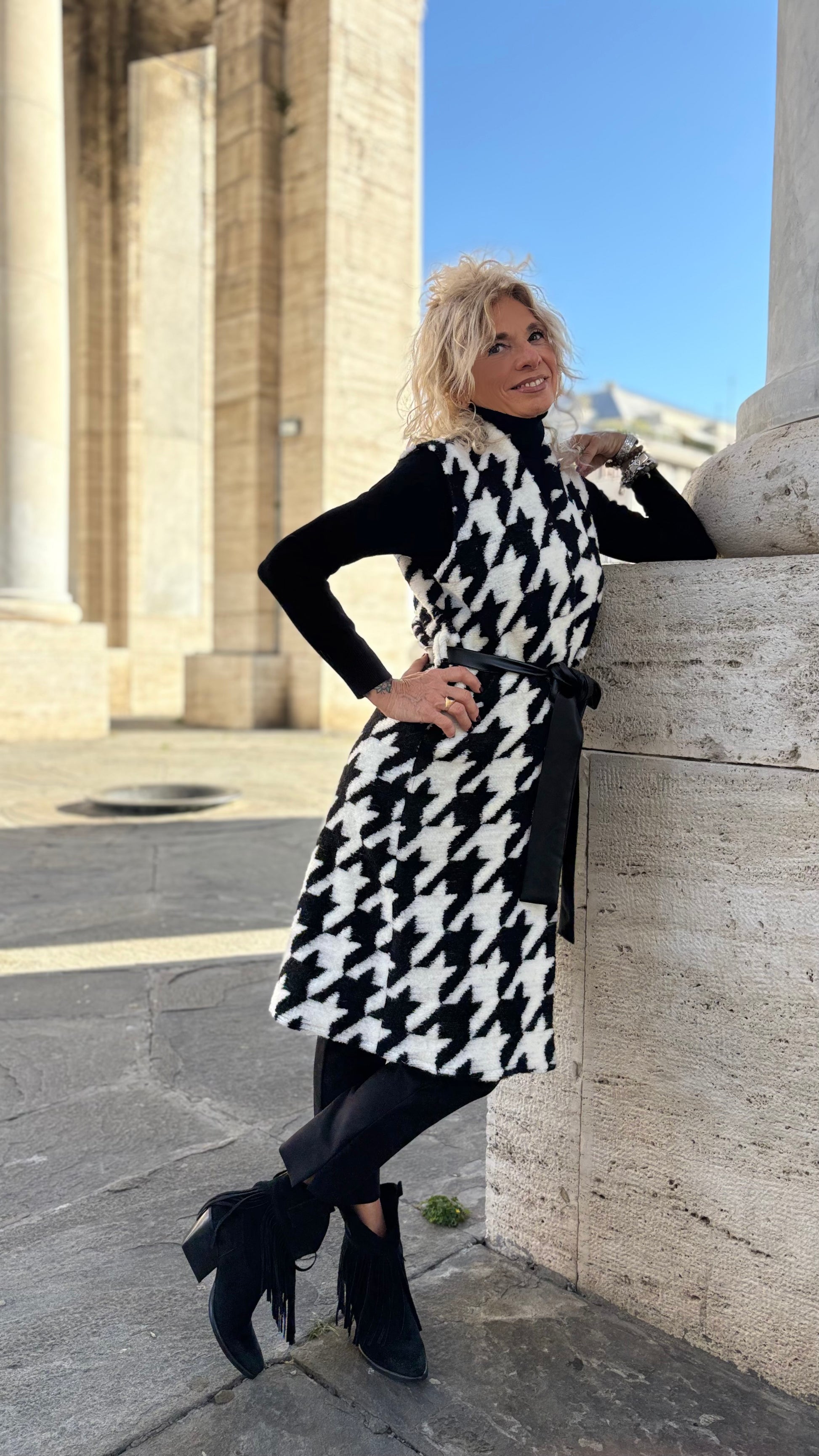 Elegante gilè realizzato completamente in sartoria, un vero pezzo unico che unisce stile e comfort. Il classico motivo pied de poule bianco e nero dona un tocco sofisticato e senza tempo.