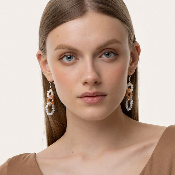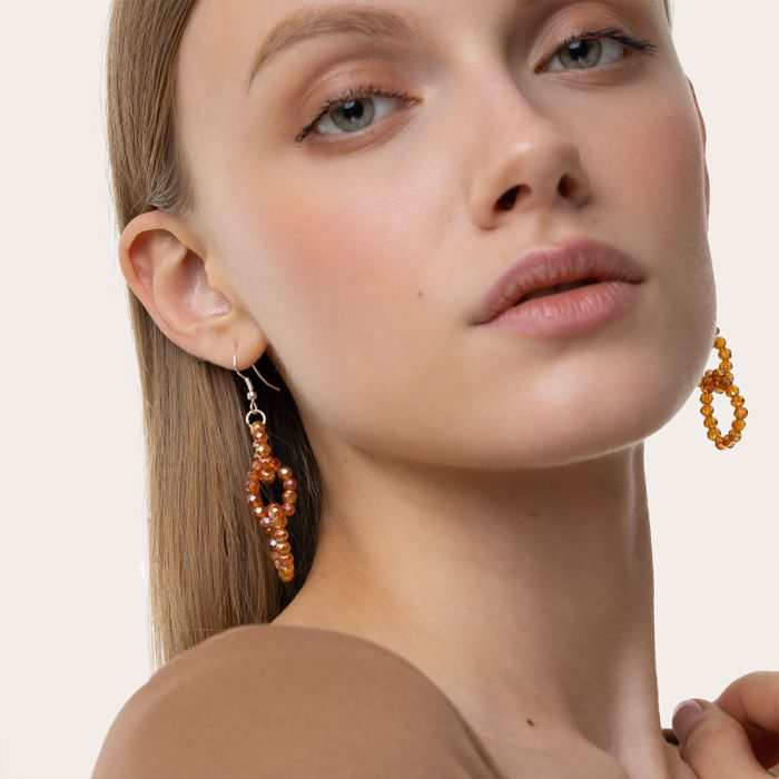 Orecchini pendenti dal design leggero e intrecciato, interamente realizzati a mano con cristalli in vetro colorato. La struttura, composta da anelli concatenati, nasce da una lavorazione artigianale su filo metallico che dona movimento e profondità al gioiello. I riflessi caldi e cangianti illuminano il viso con ogni gesto, mentre la chiusura ad amo assicura praticità e comfort. Disponibii nei colori ambra e multicolor. Materiale: vetro e placcatura argento. Nickel tested. Gioielli fatti a mano, unici e artigianali, perfetti per tutti i tuoi look o come idea regalo.