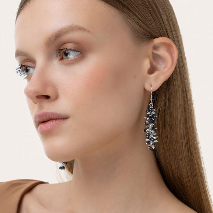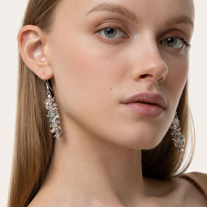 Un twist che emoziona. Questi orecchini pendenti sono realizzati interamente a mano: la base in filo metallico viene intrecciata applicando cristalli in vetro e sfere argentate. Il design a grappolo dona movimento, luce e texture a tutti i tuoi look. La chiusura ad amo è perfetta per un indosso giorno e sera. Disponibile nei colori blu notte e grigio perla/verde. Materiale: vetro e placcatura argento. Nickel tested. Gioielli fatti a mano, unici e artigianali, perfetti per tutti i tuoi look o come idea regalo.