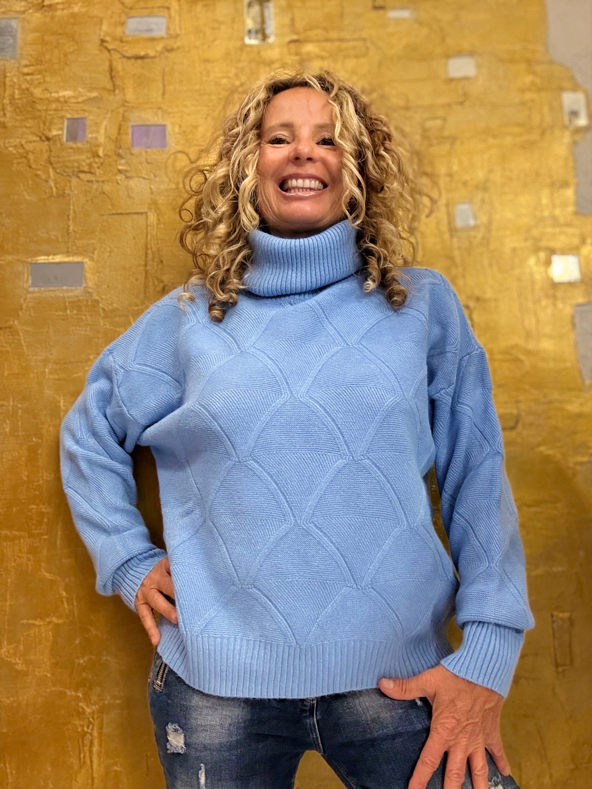 Maglia collo alto, leggermente svasata, vestibilità morbida, 50% viscosa 27% poliestere 23%poliamide